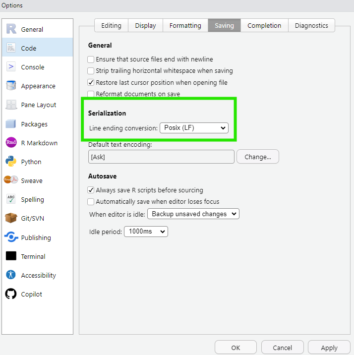 For RStudio, select Tools > Global Options > Code > Saving. Under Serialization, set the Line ending conversion to Posix (LF).