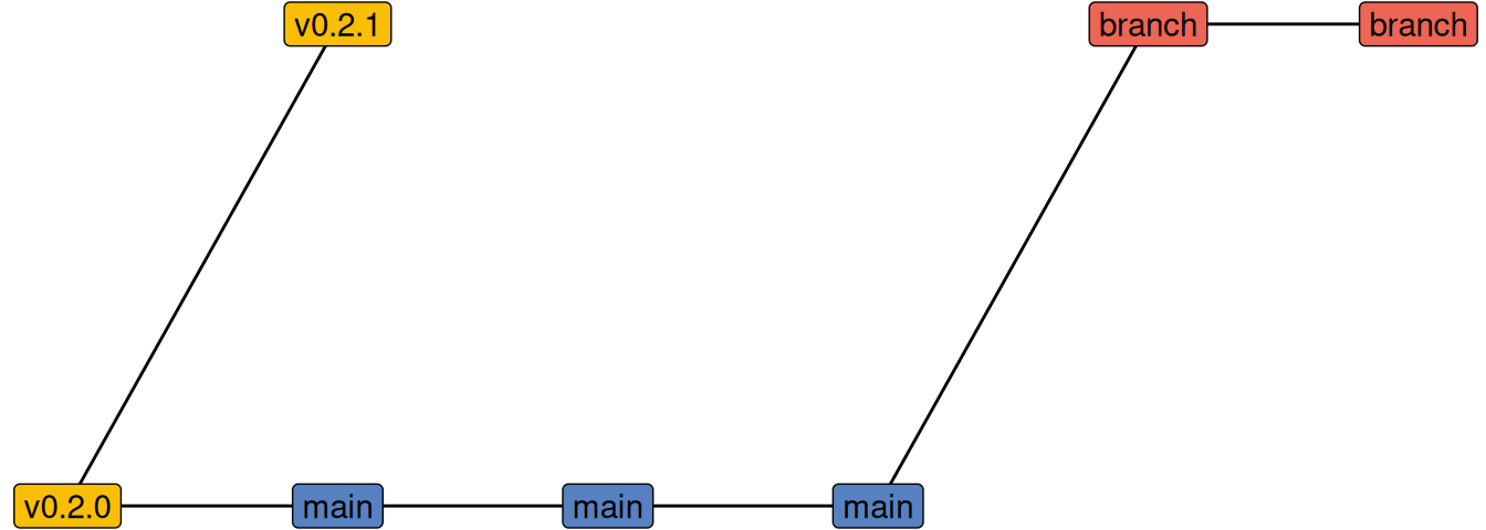 What we want to do is break the link between main and v0.2.0, instead attaching tov0.2.1. First though, I want to make sure that if I make a mistake, I’m not making it on the main branch.