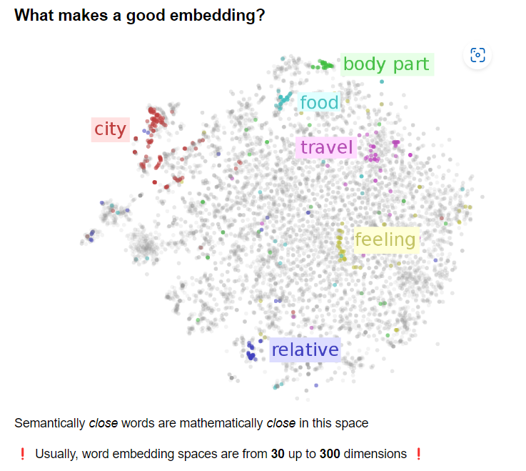 In more complex word embeddings each word was represented by between 50 to 300 numbers each