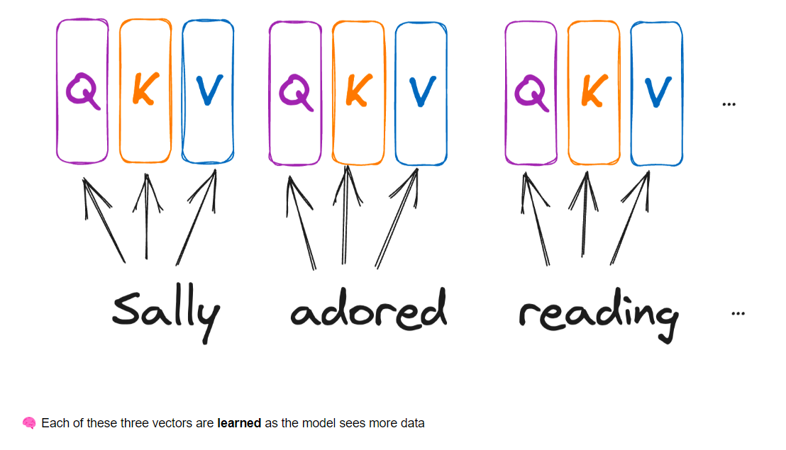 1. Each token (word) embedding gets projected ➡️ into 3 further vectors: the query, key and value vectors (usually 768 dimensions each)!!