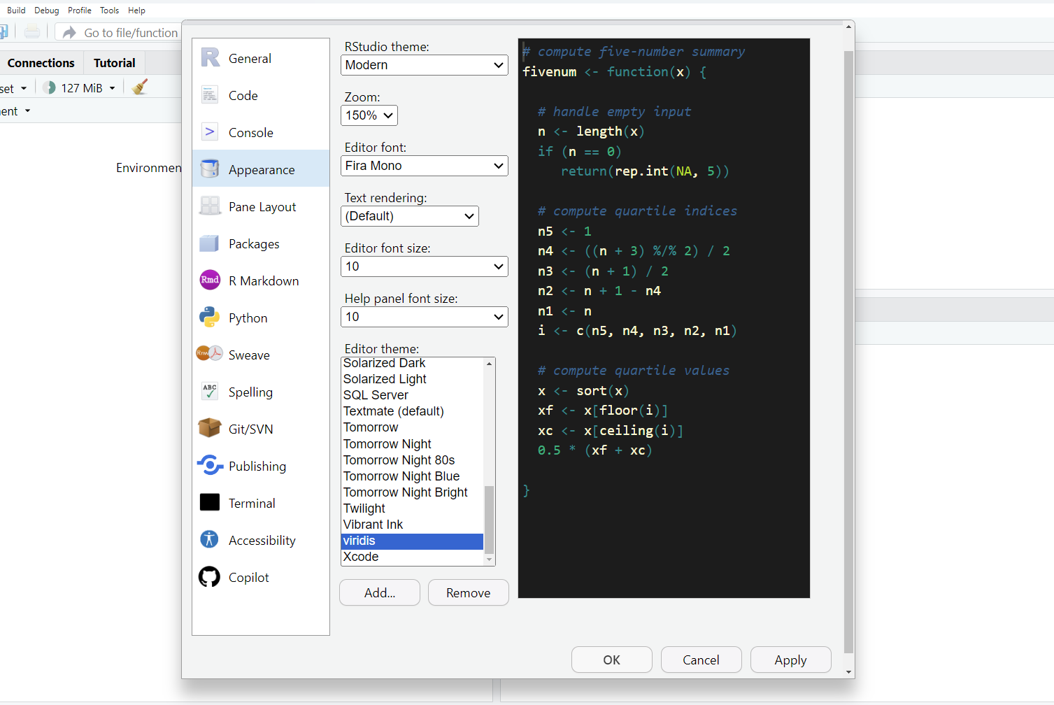 In the same ‘Appearance’ submenu as the theme settings, you can find an option to change fonts. Monospace fonts, ones where each character takes up the same width, will appear here automatically if you’ve installed them on your computer. One popular font for coding is Fira Code, which has the special property of converting certain sets of characters into ‘ligatures’, which some people find easier to read. For example, the base pipe will appear as a rightward-pointing arrow rather than its constituent vertical-pipe and greater-than symbol (|>).