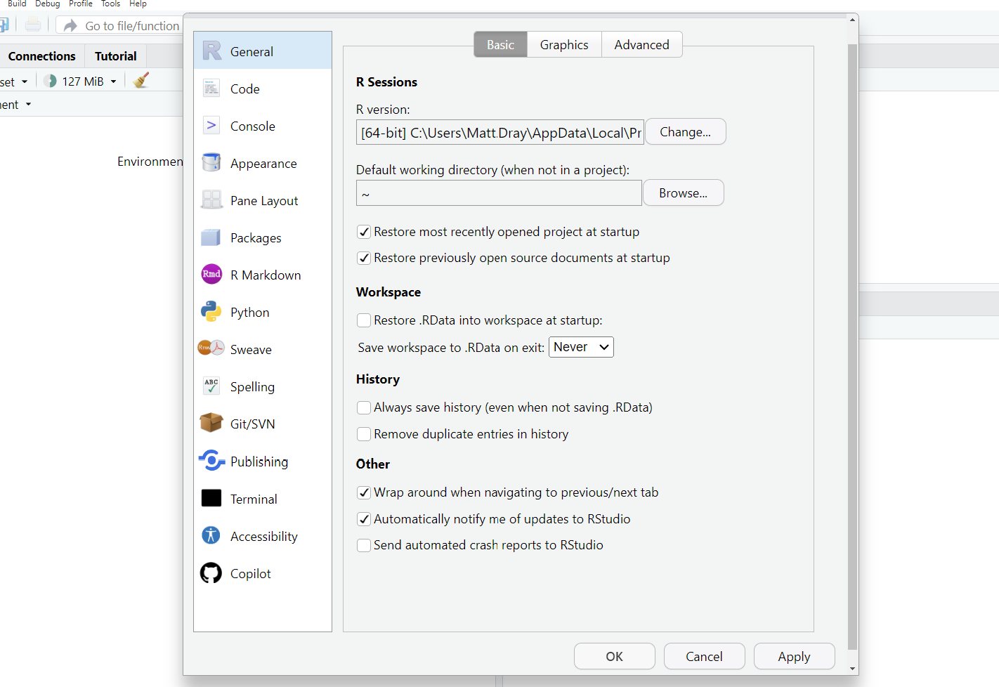 But there’s a few settings in particular that we recommend you change to help maximise reproducibility and reduce the chance of confusion. Under General > Basic, uncheck ‘Restore .Rdata into workspace at startup’ and select ‘Never’ from the dropdown options next to ‘Save workspace to .Rdata on exit’. These options mean you start with the ‘blank slate’ of an empty environment when you open a project, allowing you to rebuild objects from scratch1.