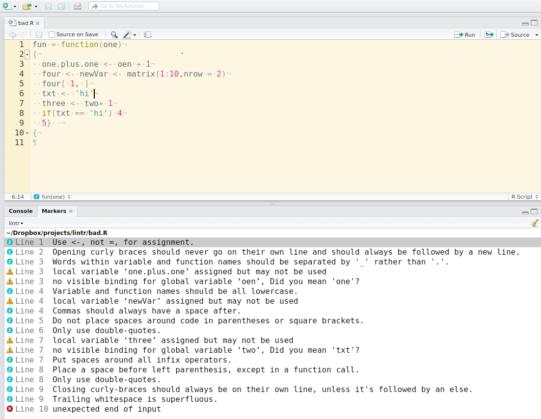 • {lintr} is a static code analysis tool that inspects your code (without running it)